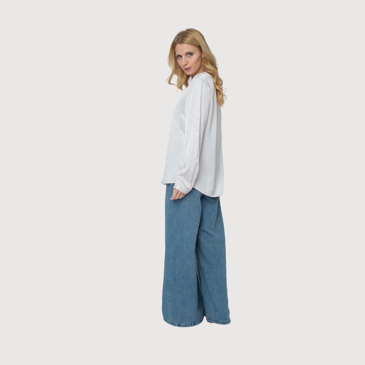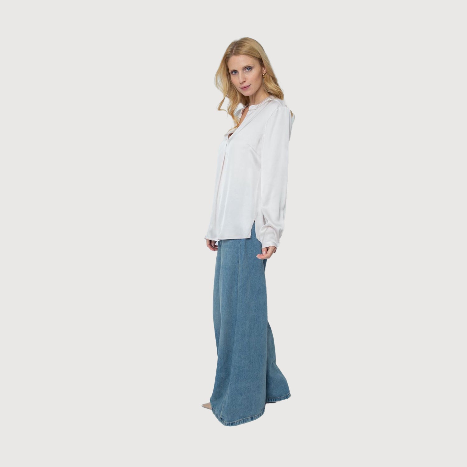 - Süße Shirtbluse mit Stehkragen, V-Ausschnitt und leichtem Weitenspiel durch Falte in der vorderen Mitte Kettchen Dekotape am Halsring Fließende Viskose Satin Ware in soften Winter-Faben nude